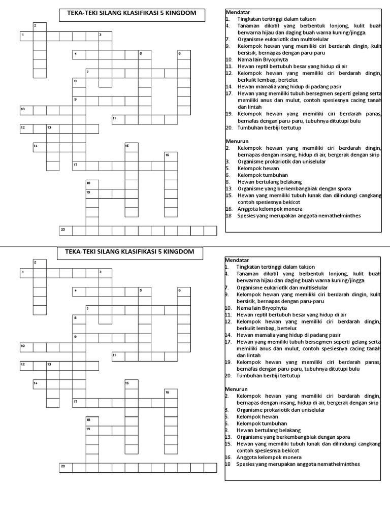 Soal Teka Teki Silang Nama Nama Hewan Bimbel Brilian from bimbelbrilian.com Kami memiliki database lebih dari 122 ribu. Nama kelomok hewan yang hidup di air, bernafas dengan insang : Mar 11, 2019 · hewan yang bertubuh lunak atau moluska merupakan hewan dengan klasifikasi terbesar kedua di dunia dalam kerajaan binatang setelah filum arthropoda (serangga). Sistem kami menemukan 25 jawaban utk pertanyaan tts hewan berbadan lunak. Hingga saat ini sudah ditemukan lebih dari 75.000 jenis moluska, ditambah dengan 35.000 hewan moluska berbentuk fosil. Nama lain ular sendok : Mollusca (hewan lunak) hewan tripoblastik selomata dengan simetri bilateral, bertubuh lunak, hidup bebas di laut, air tawar atau darat; Jawaban tts sistem kami menemukan 25 jawaban utk pertanyaan tts hewan bertubuh lunak.